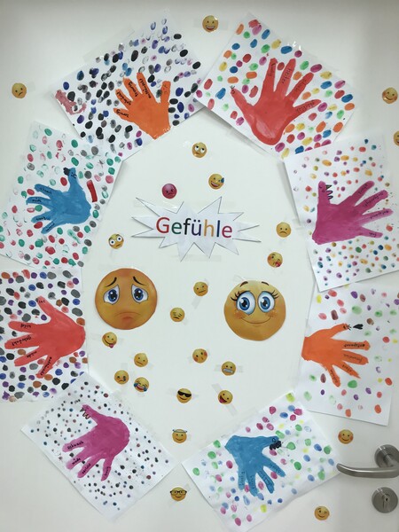 Die Kinder der V2 haben sich mit den unterschiedlichen Ausdrücken für Gefühle beschäftigt und zwei Hände gestaltet.